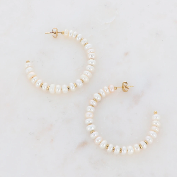 Descrição: Brincos de argola em aço inoxidável decorados com pérolas de água doce. Resistentes à água e não escurecem. Sendo pedras naturais, as suas cores podem variar de uma pedra para outra.