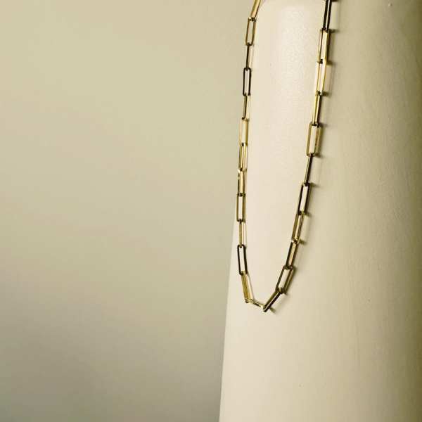 Descrição: Colar em aço inoxidável feito de elos retangulares. Resistente à água e não escurece. Comprimento da corrente: 40 cm.